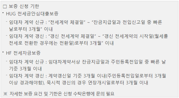 다. 기금 전세자금 대출과 별도로 담보부 보증(HF, HUG 등)에 대해서도 보증 신청 기한 내 신청 완료해야 함